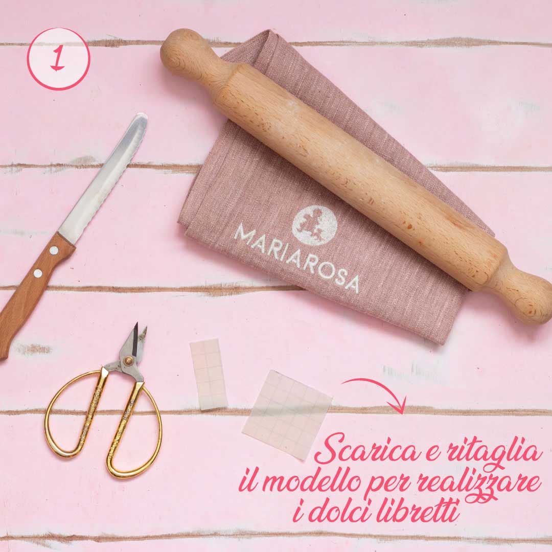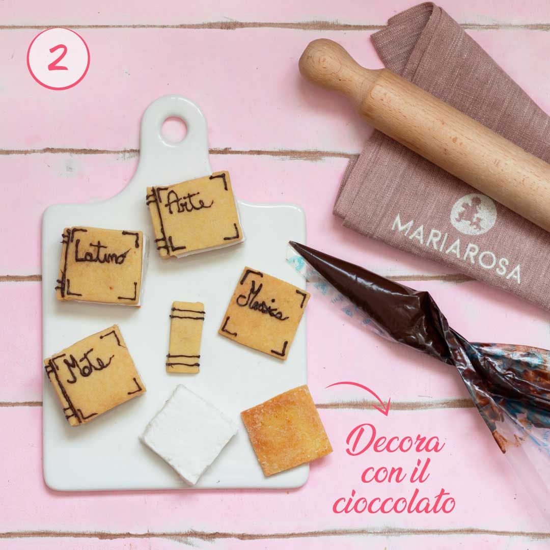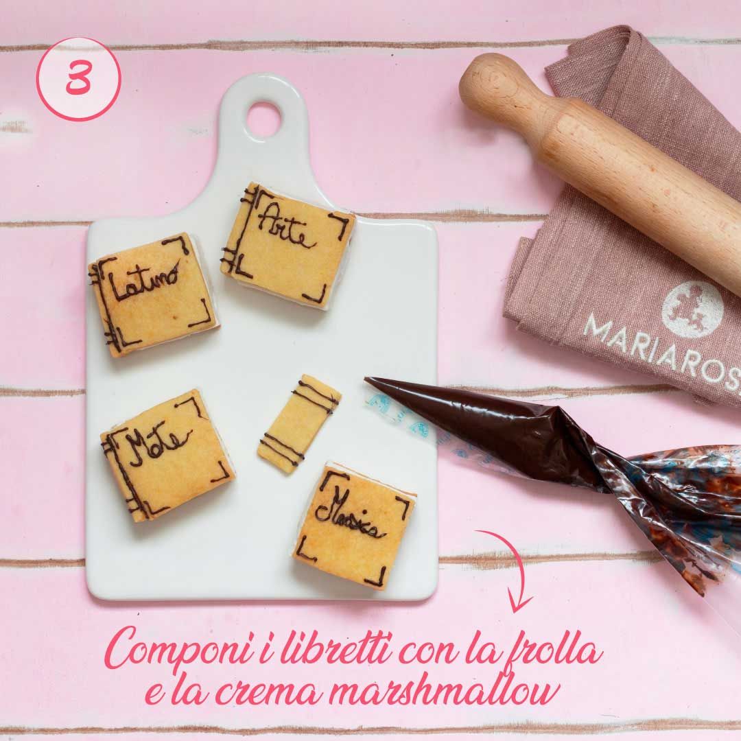 Costruite i libretti: mettete alla base un biscotto quadrato, appoggiate sopra un cubetto di crema, chiudete con un secondo biscotto quadrato e attaccate il dorso.